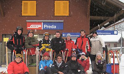 Die Fahrt durchs Albulatal verging mit viel Gesprächsstoff und einem Apéro wie im Fluge. Nach einem Zwischenhalt in Samedan zum Bezug der Unterkunft ging es zurück nach Preda, wo das effektive Schlittelabenteuer endgültig startete. Wegen starken Schneefalls war die Bahn langsamer als in den vergangenen Jahren. Trotzdem machte es riesigen Spass und auch den deutschen Kolleginnen hats gefallen. Wer nicht jede Kurve kriegte, landete dank Neuschnee sogar weich. Nach der ersten Abfahrt ging es zum Aufwärmen und zum Fondueplausch ins Bergrestaurant in Preda. Die zweite Abfahrt fand nachts bei beleuchteter Piste statt. Einige Hardcore-Schlittler wagten sogar eine dritte Fahrt. Kurz bevor der letzte Zug am Bahnhof Bergün fuhr, wurde Pablo sichtlich nervös, weil die zwei letzten Schlittler noch nicht da waren. In letzter Sekunde trafen die beiden ein und erwischten den Zug gerade noch. Zurück in Samedan, ging wer wollte noch in eine Discothek. Einige gingen früher schlafen, andere ein bisschen später ...