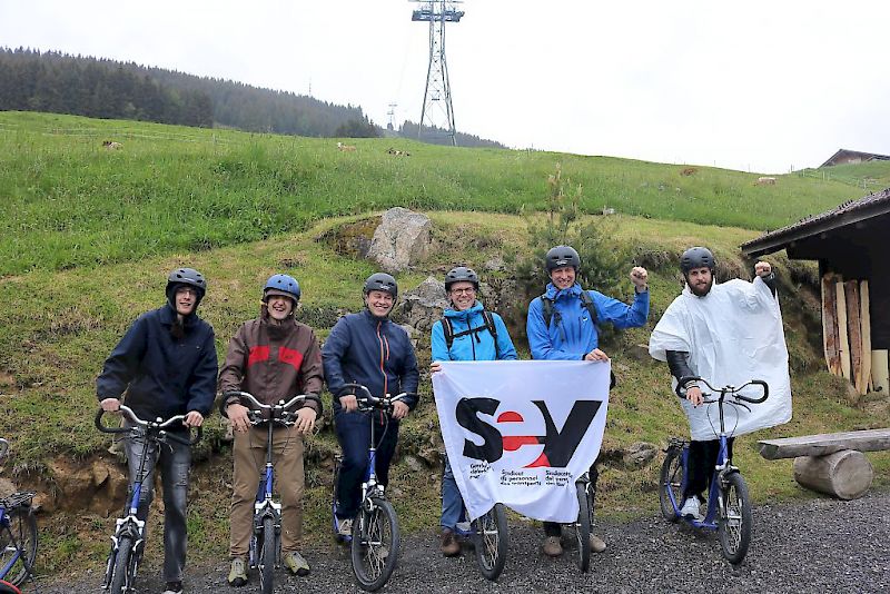 Nach einer individuellen Anreise trafen wir uns pünktlich um 12:30 Uhr in Thun beim angesagten Treffpunkt. Unterwegs fuhren einzelne Teilnehmende bereits mehrmals durch den Regen, was uns etwas zweifeln lies, ob unser Entscheid, den Trottiplausch durchzuführen, auch wirklich schlau war. Kaum waren wir jedoch auf dem Dampfschiff «Blümlisalp», welches uns von Thun in die Beatenbucht chauffierte, musste nichts mehr diskutiert werden: Die Sonne schien und so manch einer hatte bereits Angst, sich einen Sonnenbrand einzufangen. In der Beatenbucht angekommen, beeilten wir uns, um das Anschlussbähnli auf den Beatenberg nicht zu verpassen. Leicht erstaunt stellten wir fest, dass uns der ganze Wagen alleine gehörte. Weiter ging es mit der Gondelbahn bis ins Niederhorn-Vorsass, wo wir unsere Trottis und die Helme entgegennehmen konnten. Nach einer kurzen Instruktion und dem Helmcheck ging es mit dem Trotti bei leichtem Nieselregen in Richtung Beatenberg. Während unserer Abfahrt entpuppten sich einige als grosse Kuh-Fans. Da durfte das obligate Selfie nicht fehlen! Unfallfrei trafen wir ca. eine Stunde später in Beatenberg ein und gönnten uns erst einmal eine Erfrischung im hiesigen „Bahnhofbuffet“. Nach der Talfahrt nahmen wir den STI-Bus Richtung Thun. Kaum eingestiegen, «schiffte es wie aus Kübeln». Wir hatten riesiges Wetterglück! In Thun endete unser Trottiplausch offiziell, was uns allerdings nicht daran hinderte, den Tag bei einem gemeinsamen Abendessen in Bern ausklingen zu lassen.